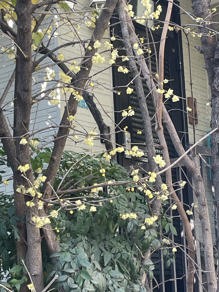 近くの民家の蝋梅と近くの神社の白梅、紅梅です。寒い中、頑張って咲いていますね。