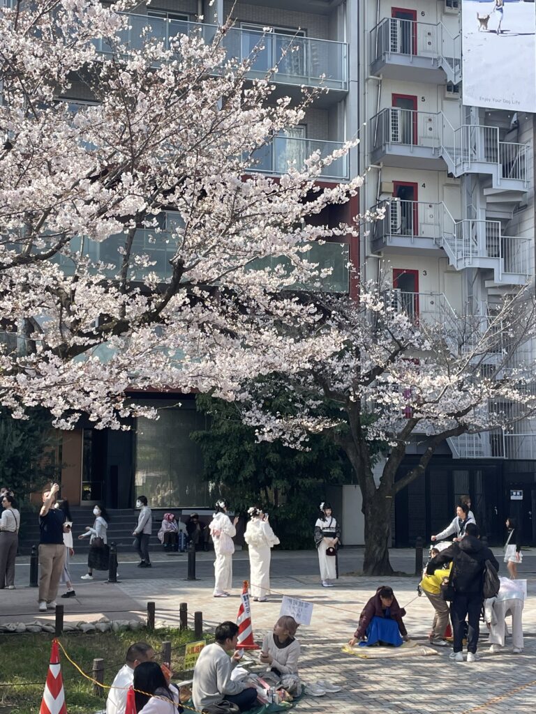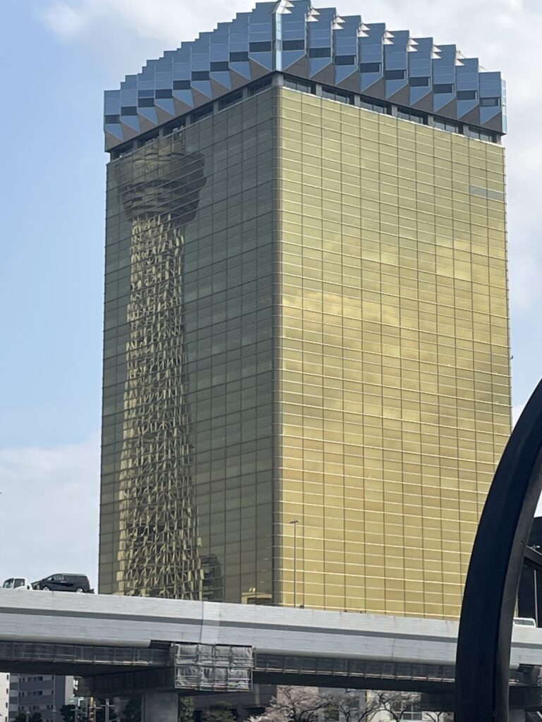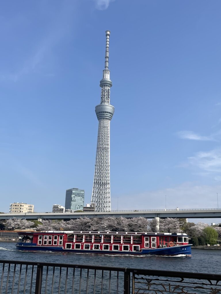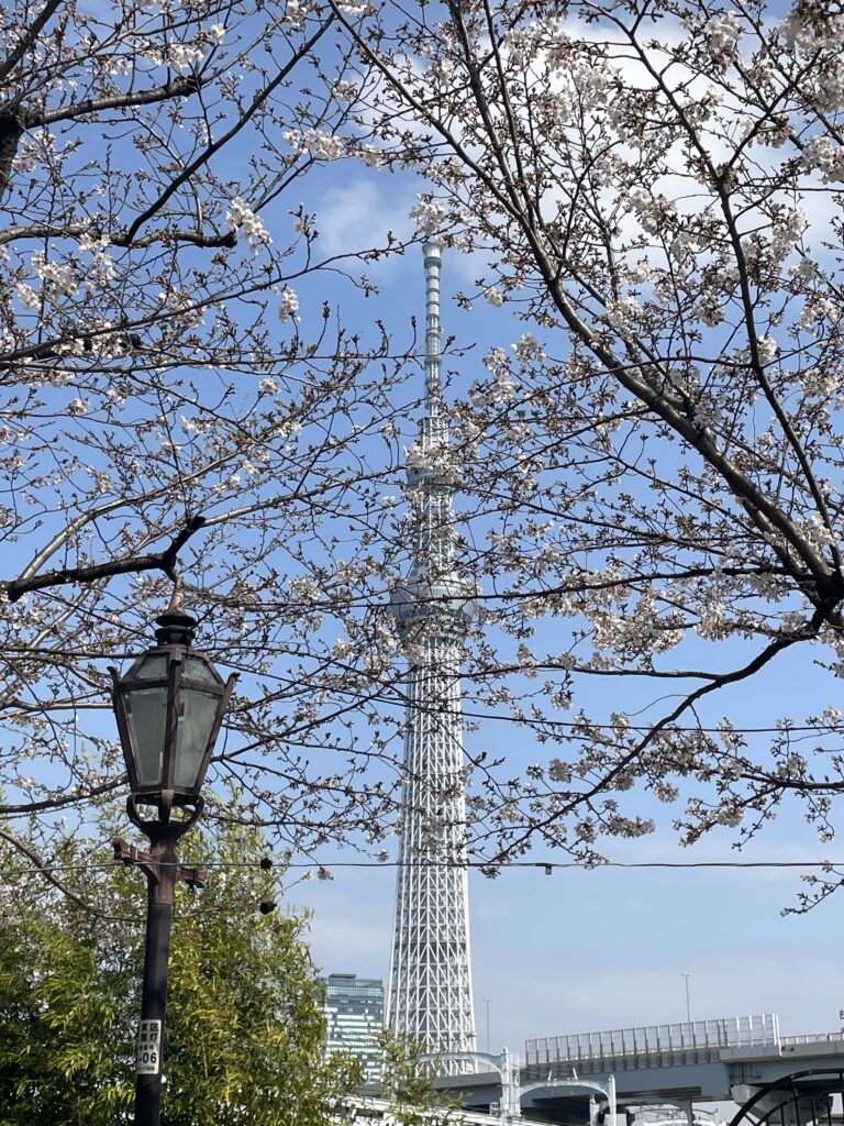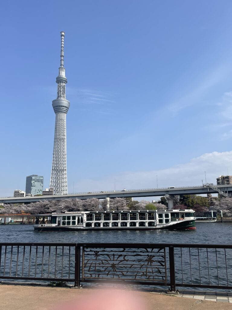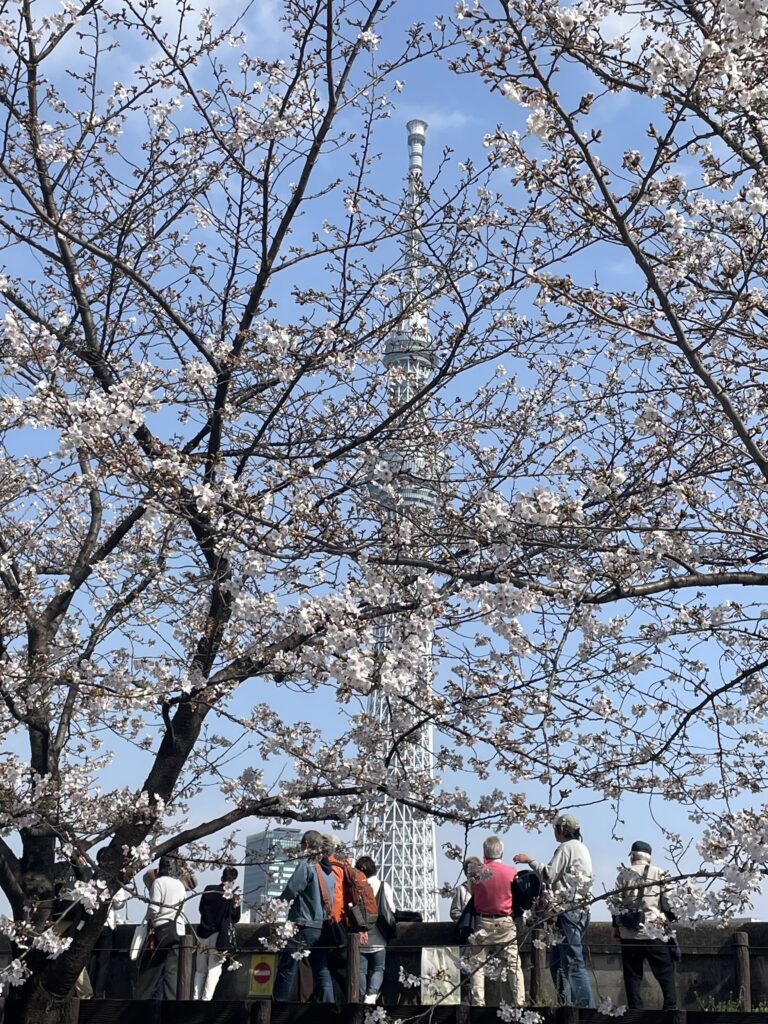 午後は、地下鉄銀座線に乗って浅草まで行き、隅田公園で花見をしました。ここでは和服を着ている人が目立ちました。隅田公園は距離が長いので上野公園のような混雑はありませんでした。川縁にちょうど座れるとことがあり、川と対岸の桜とスカイツリー、時々通る船を眺めながら過ごしました。アサヒビールの建物にスカイツリーが写っている珍しい写真も撮れました。